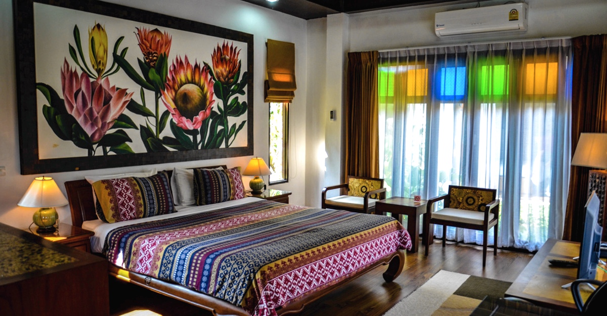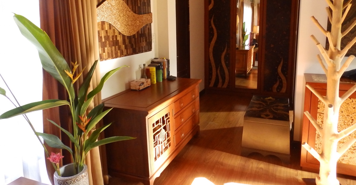 Master BedroomTeak furniture and modern inlaid pieces. -
